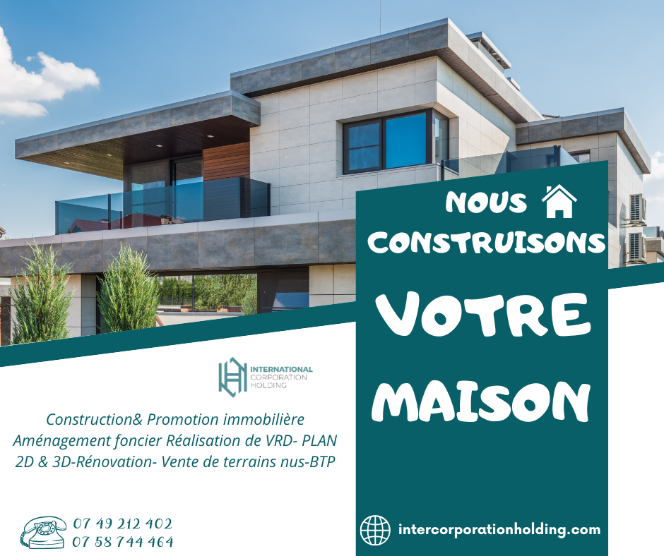 Vous envisagez d'investir dans l'immobilier pour Construire et revendre ? Vous souhaitez créer des espaces de vie en apportant du bon standing ? Vous rêvez de résider dans des cités résidentielles conviviales et attractives ? Confiez nous la réalisation de tous vos projets immobiliers . Notre équipe se consacre à la transformation des environnements par le biais de projets immobiliers ambitieux et de solutions logistiques innovantes, grâce à une expertise reconnue nous pilotons avec passion des initiatives de construction, d'architecture, VRD et de rénovation, tout en assurant une gestion et une coordination efficace des flux afin de transformer vos idées et vos attentes. Notre approche est centrée sur le développement commercial durable et la satisfaction client, incarnée par le succès de projets complexes en BTP,VRD ainsi que la fidélisation de notre clientèle. PASSION - RIGUEUR -TRAVAIL- SATISFACTION - ÉCOUTE-DELAI RESPECTÉ sont au cœur de notre stratégie pour l'excellence opérationnelle et la prospérité des affaires vis à vis de clients. Nous réalisons vos préférences et vos contraintes budgétaires afin de créer une solution personnalisée qui répondra à toutes vos attentes. Demander un devis maintenant ou prenez un rendez-vous dans locaux pour une meilleure prise en charge .